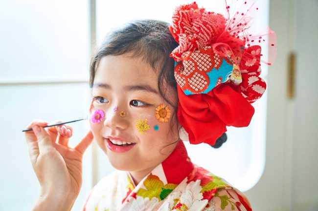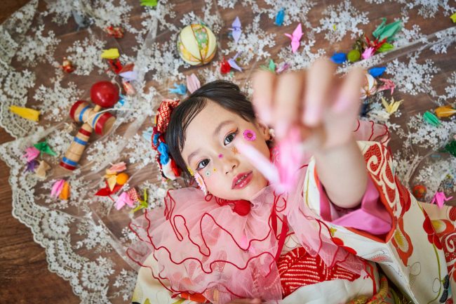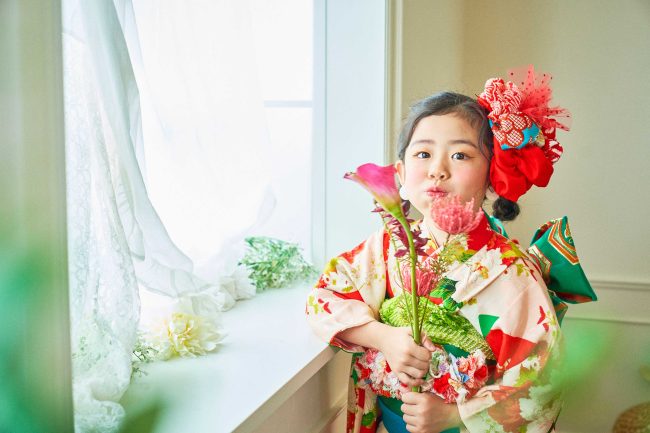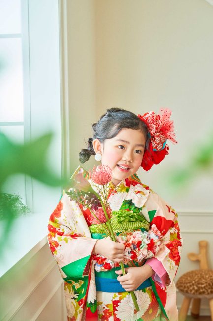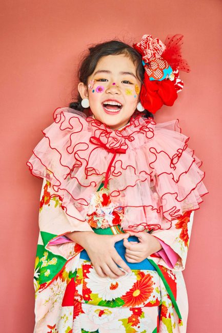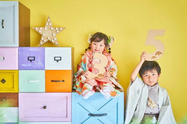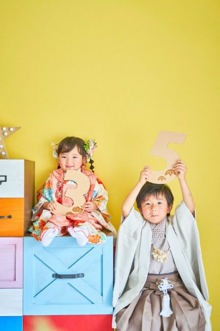 七五三撮影フォトギャラリー② 2025/10/24 | 七五三 | グレー漆喰の壁でシックな雰囲気と、自然光降り注ぐお部屋でのポップな雰囲気での2種類の撮影を行います。 お好きな背景で、家族写真も撮影いたします。